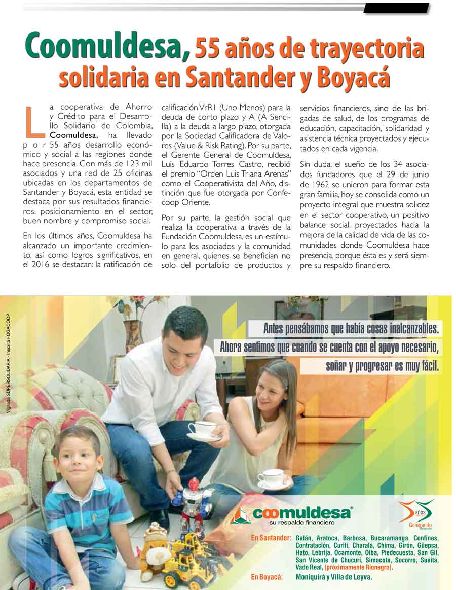 EMPRESAS Coomuldesa, 55 años de trayectoria solidaria en Santander y Boyacá Tags: Navegación de entradas Previous Previous post: Santander ejemplo de cooperativismoNext Next post: Santander tierra que enamora Editor General Follow Me: Related Posts 11 Cooperativas mostraron dificultades en su índice ebitda al cierre de 2021 Superintendencia toma posesión inmediata de Fotranorte por grave crisis financiera y patrimonial 23% de los colombianos aprovechará el Black Friday para comprar sus regalos: Appinio